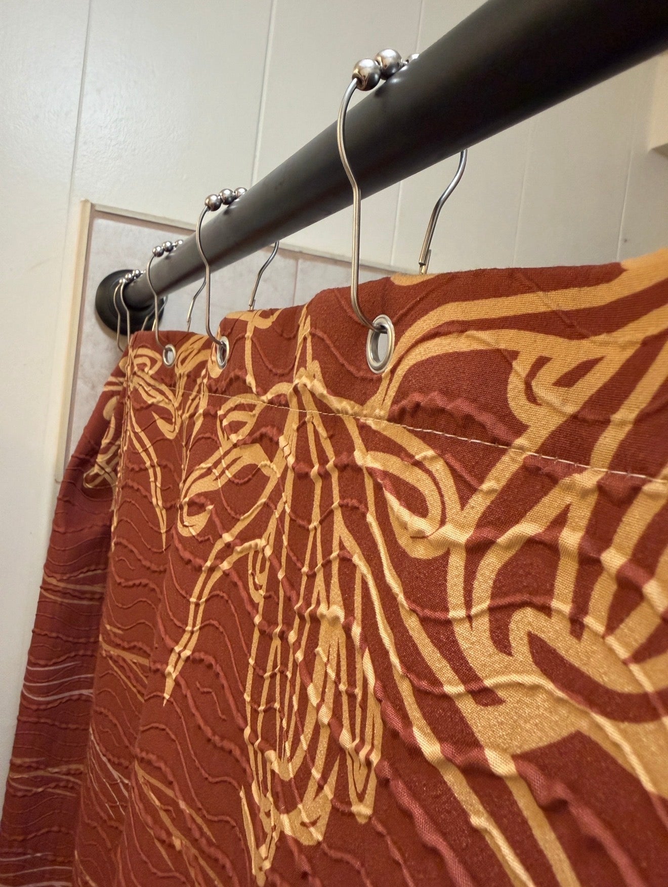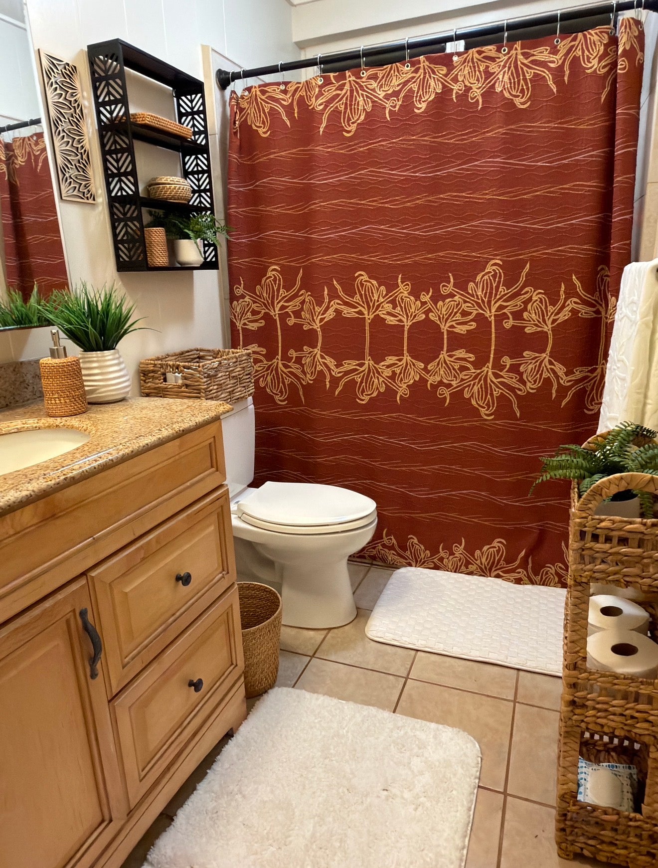 Warm, earthy, and luminous, the Moso’oi Golden Hour shower curtain captures the magic of sunset. Bronze rustic tones blend with soft golden florals to create a rich, inviting atmosphere. The moso’oi blossoms glow against the warm background, making this design perfect for homes with complementary textures of natural woods, greenery, and earthy tones.