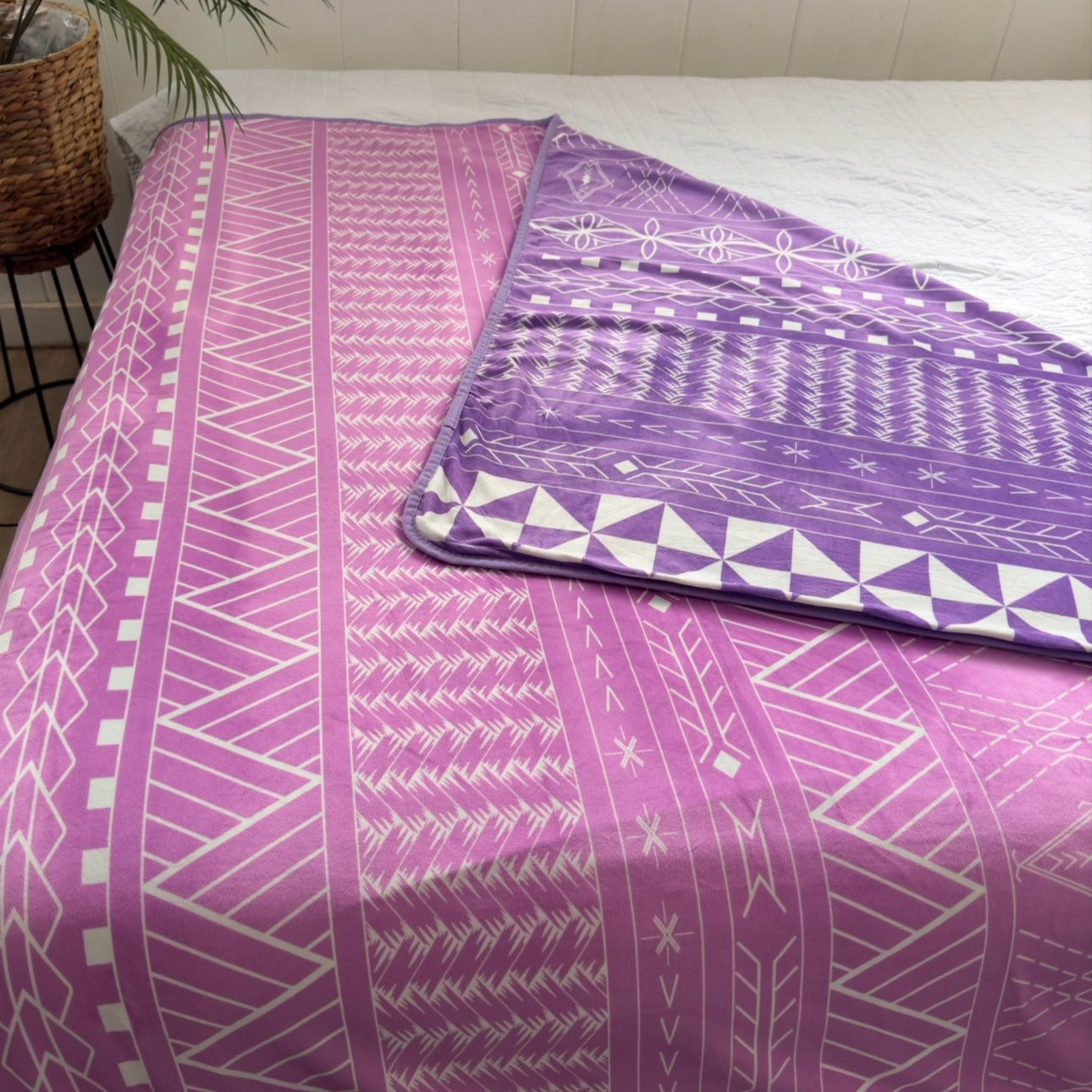 Crafted from a refined blend of breathable fibers with a gentle, soothing weight, it offers a luxurious feel that invites rest and ease. Each side reveals a distinct composition—modern in form, yet rooted in Polynesian-inspired motifs that speak to origin, resilience, and protection.