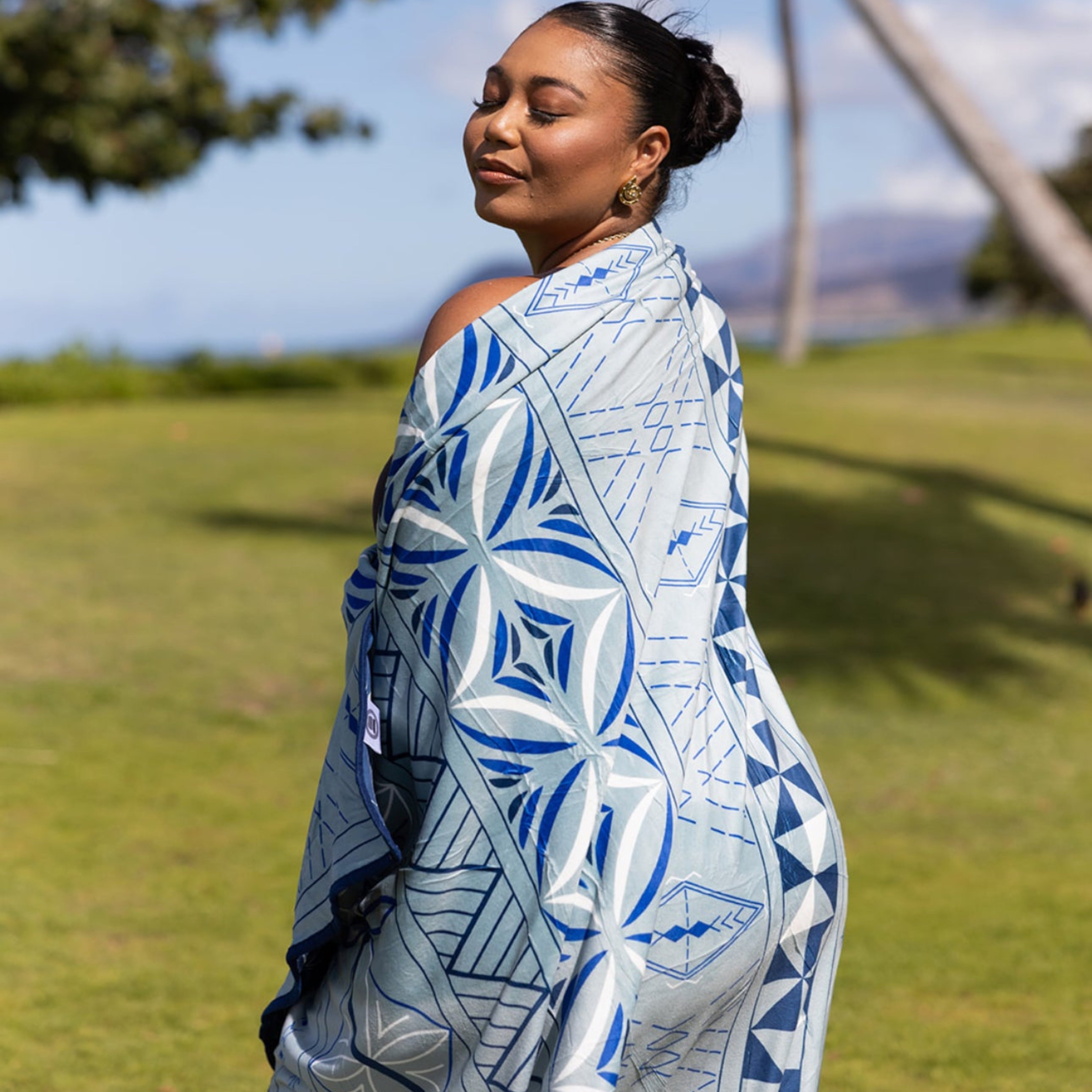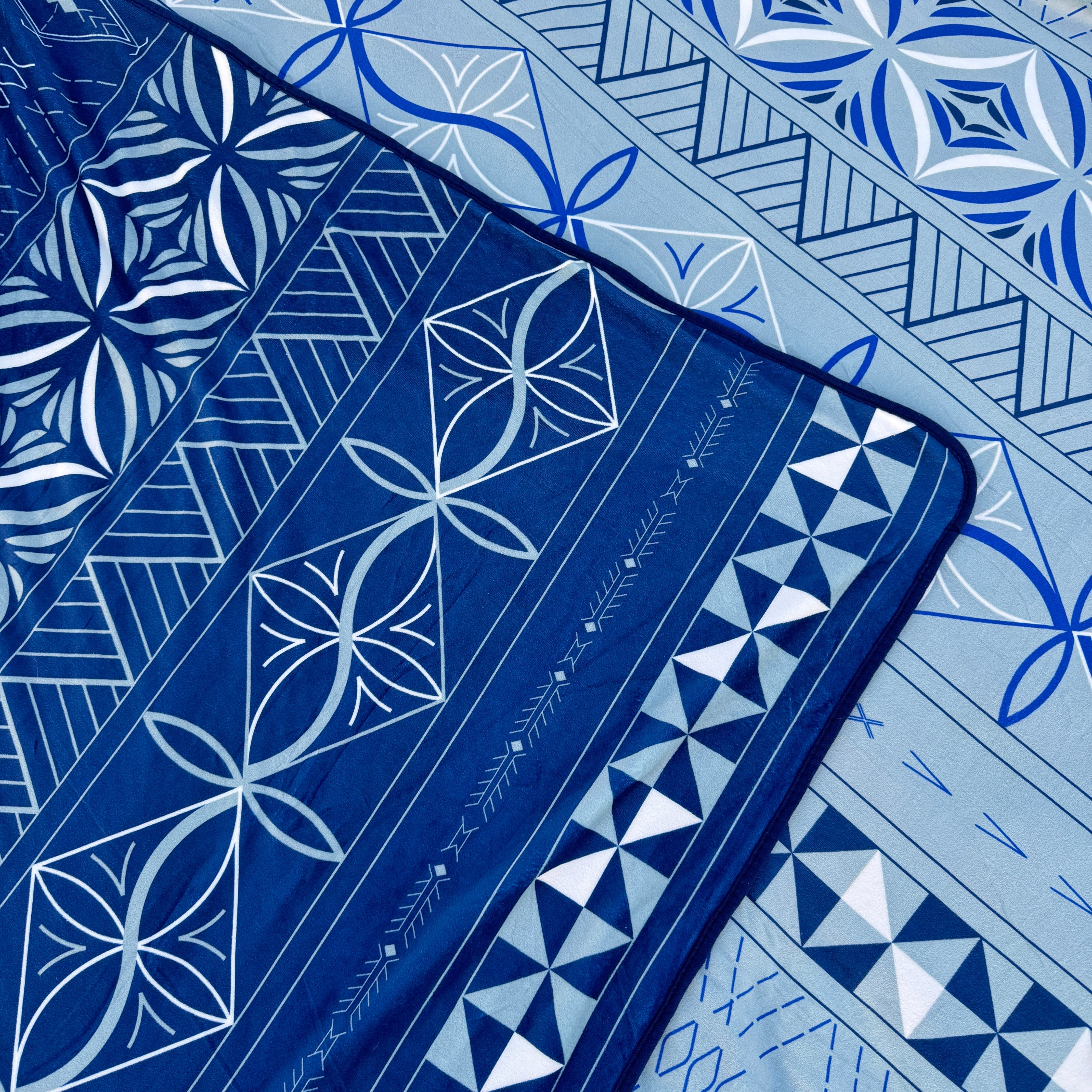 Crafted from a refined blend of breathable fibers with a gentle, soothing weight, it offers a luxurious feel that invites rest and ease. Each side reveals a distinct composition—modern in form, yet rooted in Polynesian-inspired motifs that speak to origin, resilience, and protection.