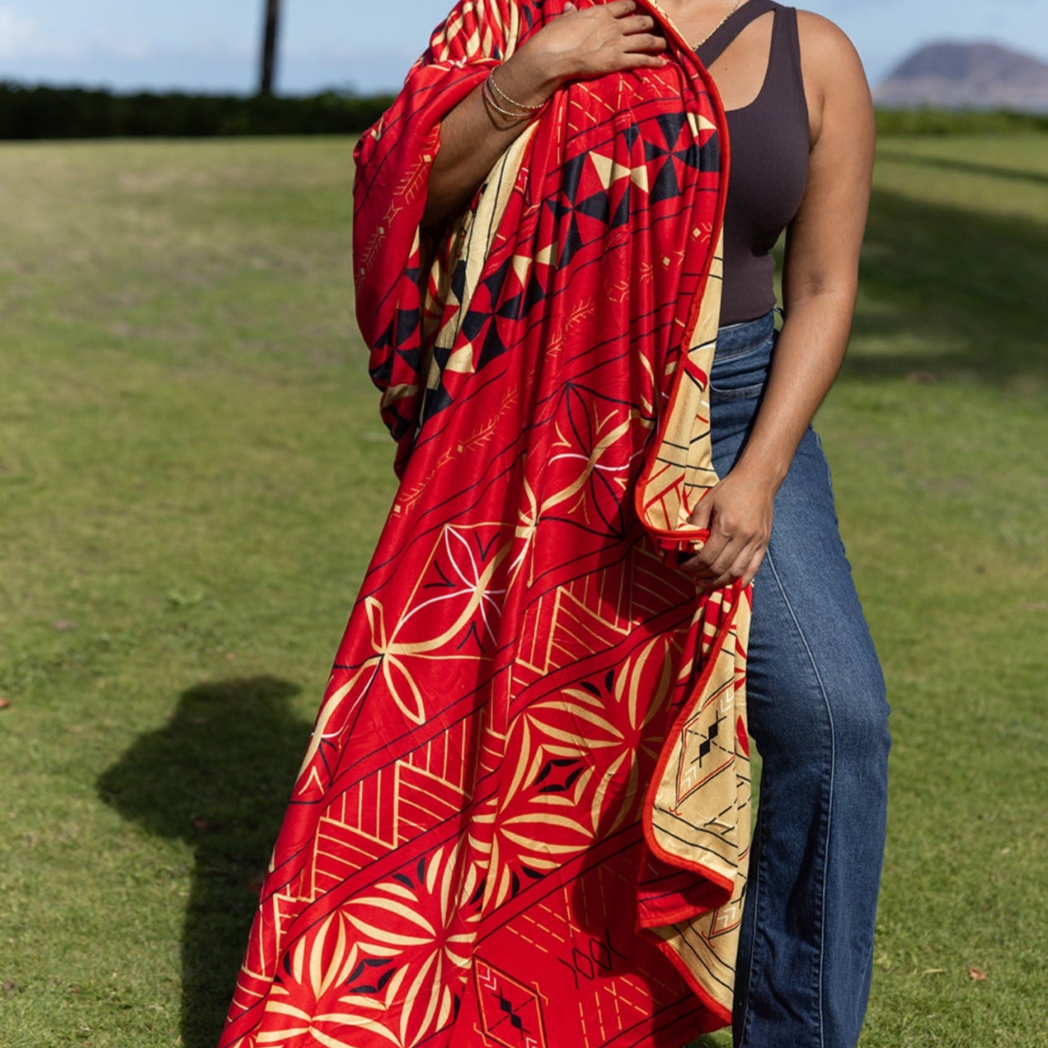 Crafted from a refined blend of breathable fibers with a gentle, soothing weight, it offers a luxurious feel that invites rest and ease. Each side reveals a distinct composition—modern in form, yet rooted in Polynesian-inspired motifs that speak to origin, resilience, and protection.