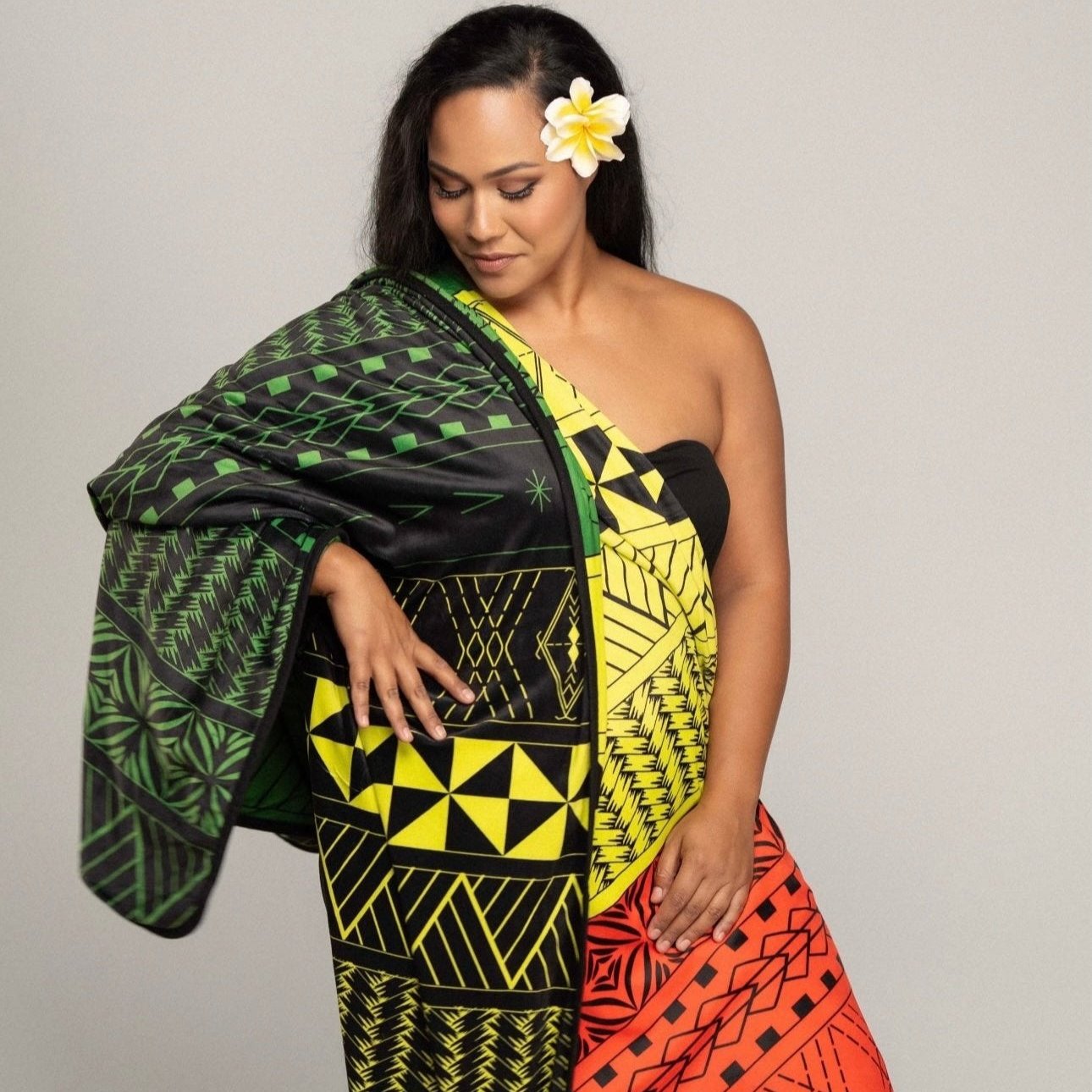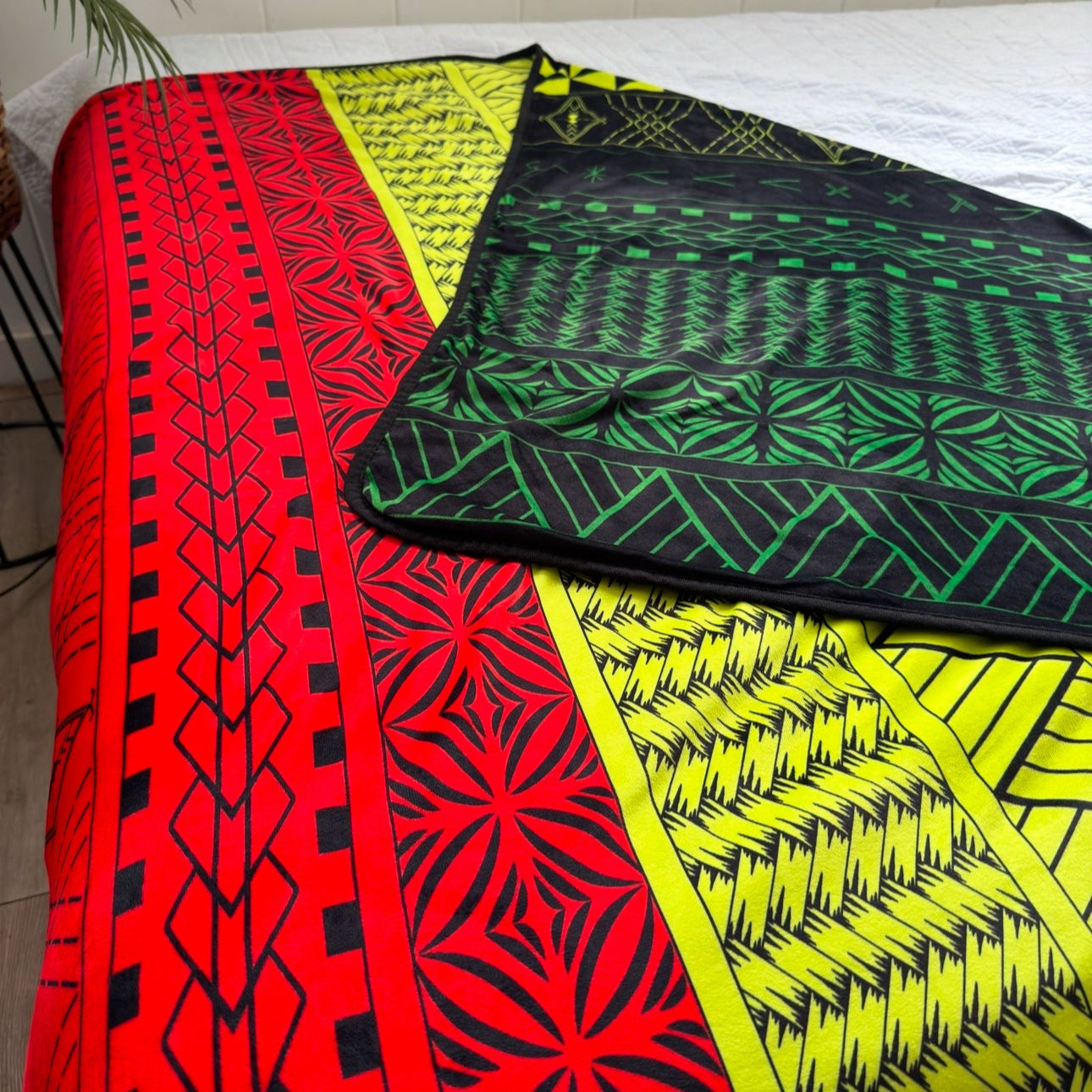 Crafted from a refined blend of breathable fibers with a gentle, soothing weight, it offers a luxurious feel that invites rest and ease. Each side reveals a distinct composition—modern in form, yet rooted in Polynesian-inspired motifs that speak to origin, resilience, and protection.
