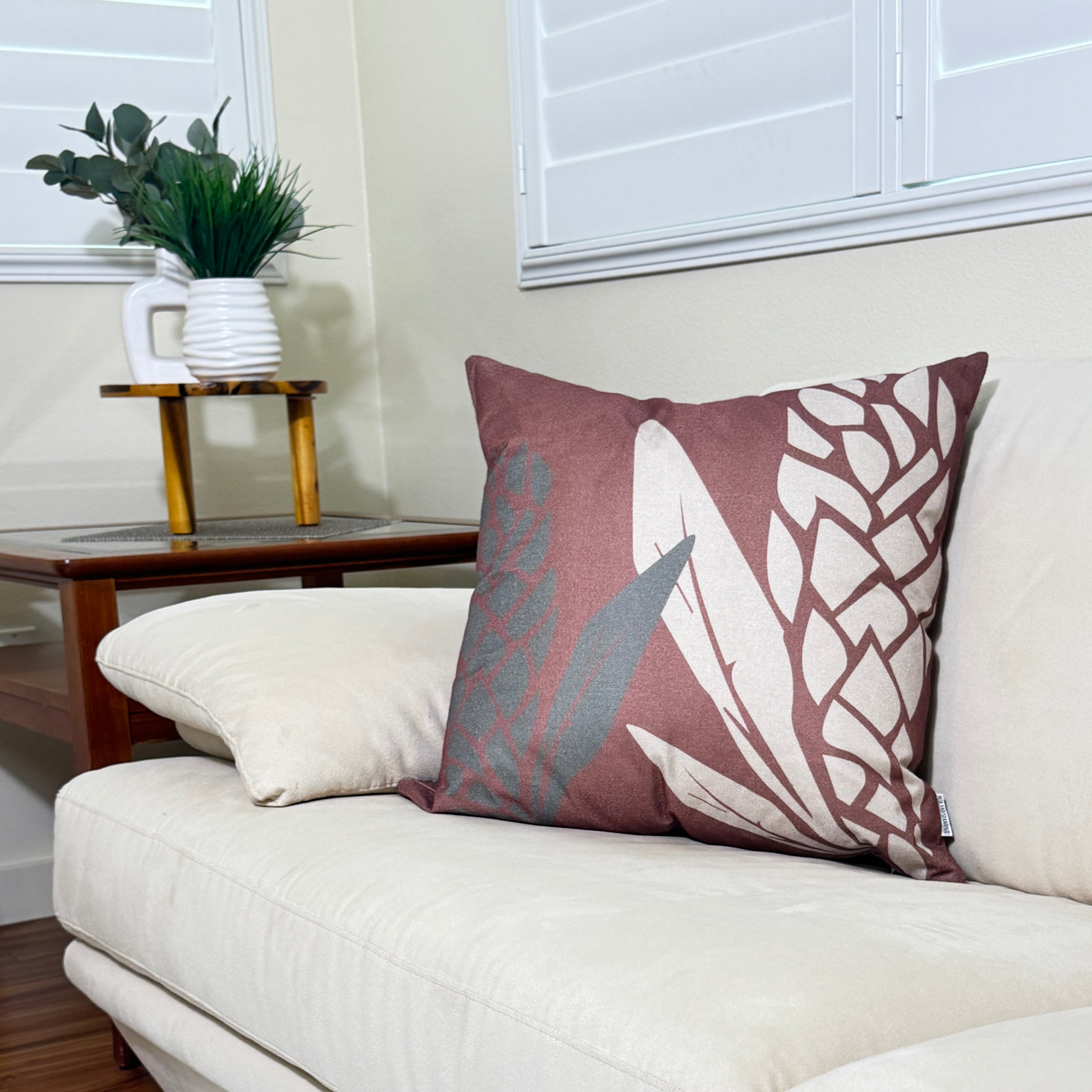 A pair of Teuila flowers rest on a mauve background, adding gentle warmth and Polynesian charm. This pillow boasts gentle inviting tones and is ideal for layering or creating a soft, inviting atmosphere.