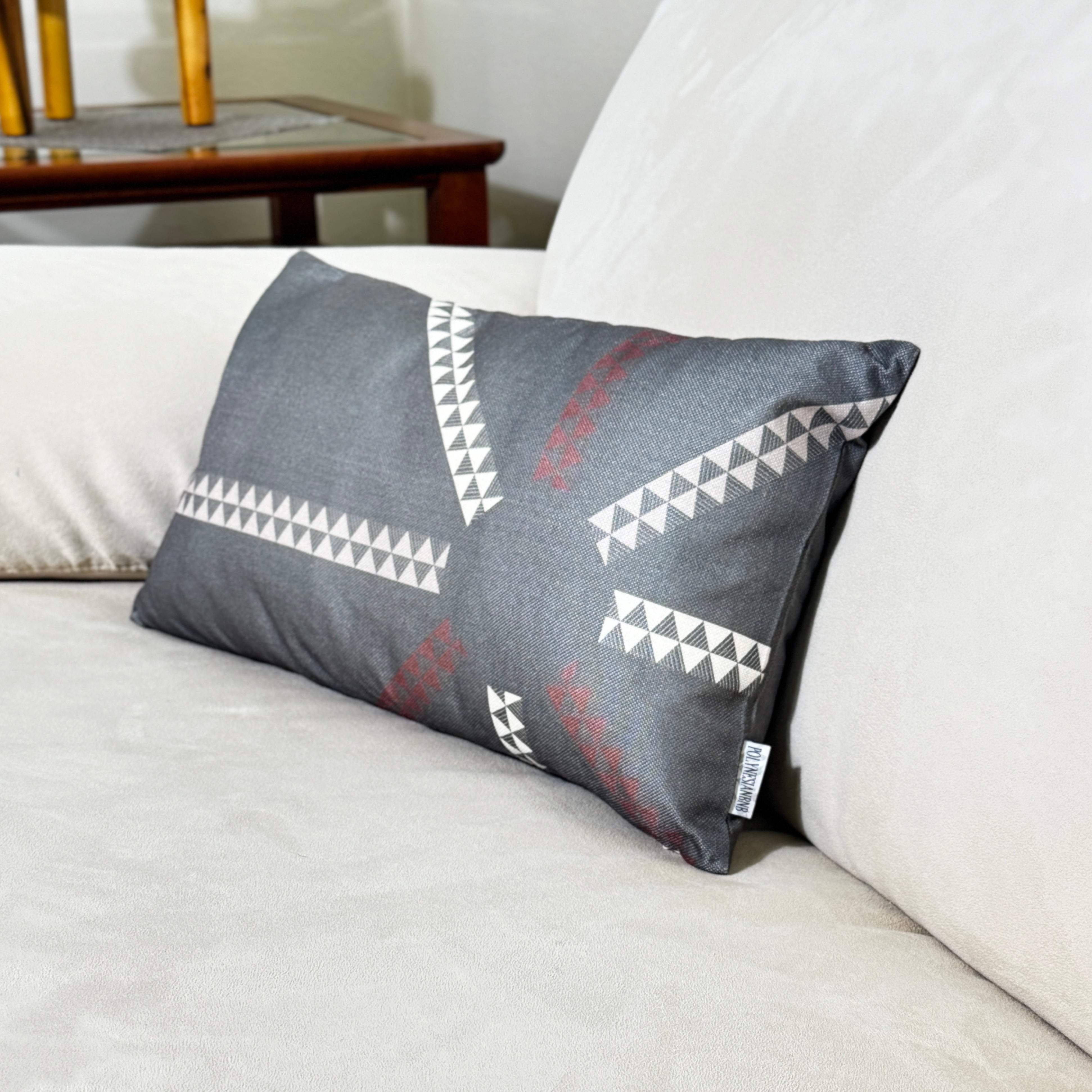 Intentional symmetry inspired by traditional 'ohe kāpala (kapa stamping) on a soft olive background. This lumbar pillow blends unique design and authentic artistry, adding balance to any space.