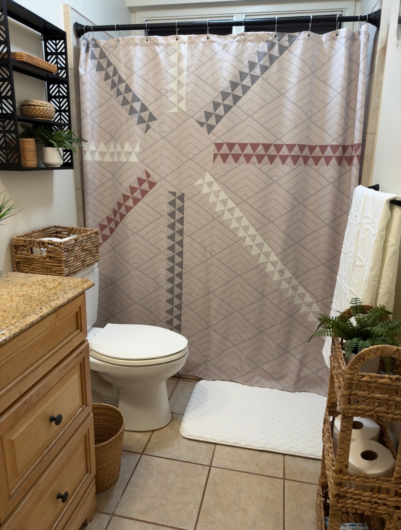 Elevate your bathroom with the warm, grounded beauty of the Teuila Sandstone shower curtain. This design blends soft taupe tones with traditional 'ohe kāpala and modern tatau-inspired pathways that extend outward like guiding lines etched in stone. Each geometric direction represents movement, protection, and the cultural journey carried through our Polynesian heritage.