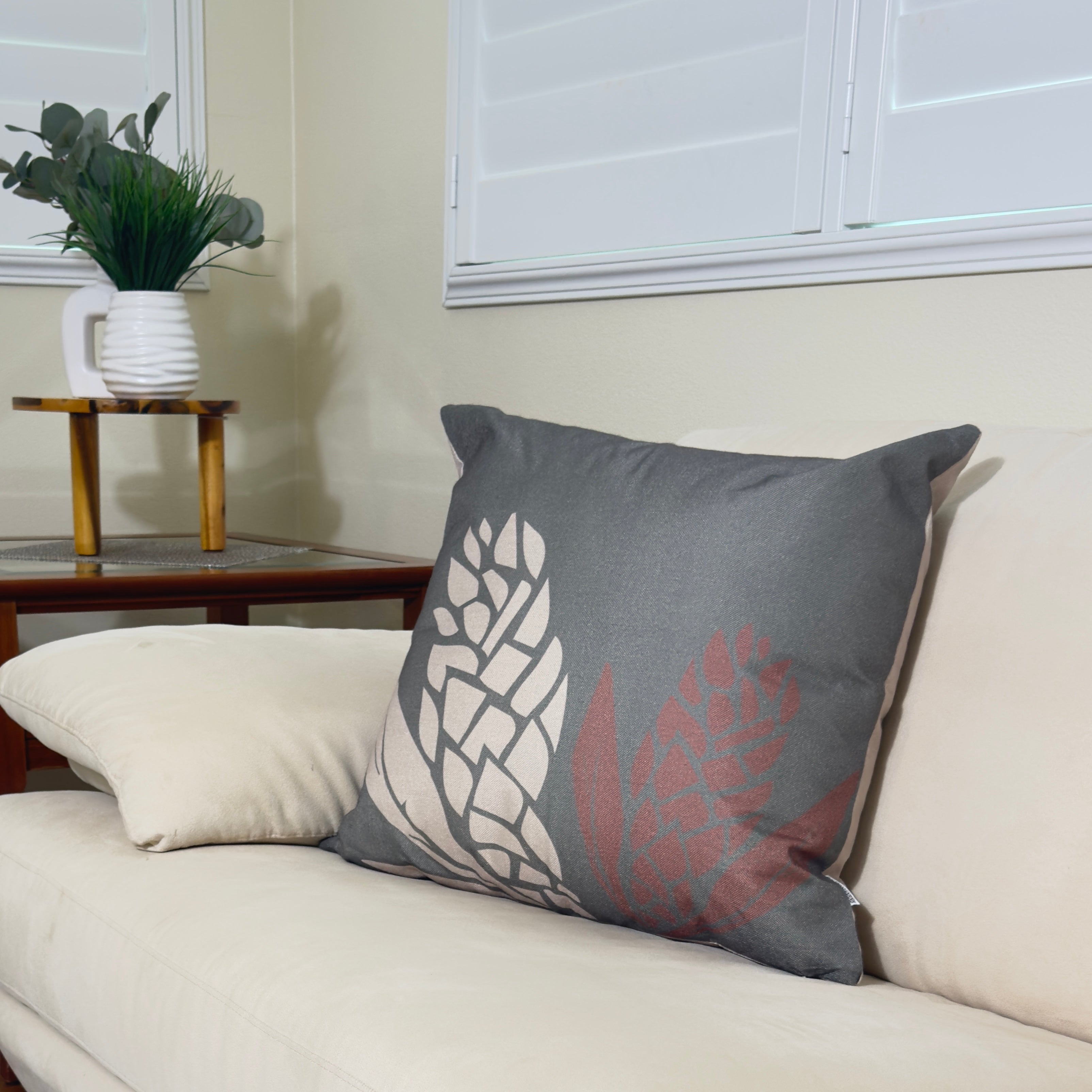 Two delicate Teuila flowers float on a soft light olive green background, creating a calming, nature-inspired accent. This pillow cover evokes the tranquility of tropical island gardens.